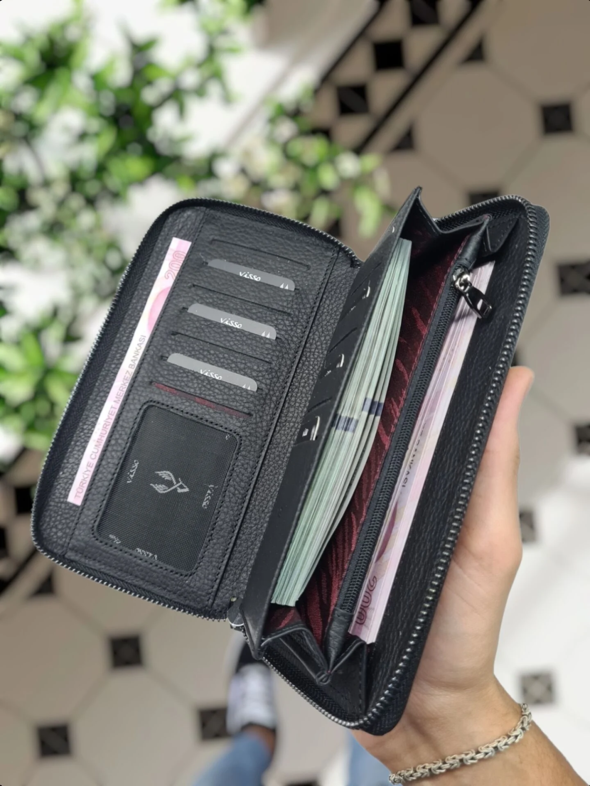 Visso 453 telefon bölməli həqiqi dəri fermaurlı qara əl çantası / cüzdan